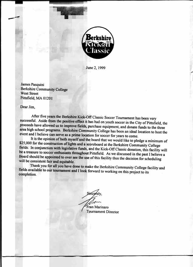 | On June 2, 1999 the Berkshire Kick-Off Classic Soccer Tournament, a community-supported soccer tournament, announced plans to improve the soccer fields on the campus of Berkshire Community College. The group pledged $25,000 for the construction of lights and a scoreboard and added “In conjunction with legislative funds, and the Kick-Off Classic donation, this facility will be a treasure to soccer enthusiasts throughout Pittsfield.” The construction of a pressbox was soon added to the project. |