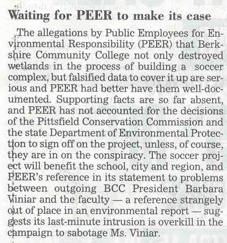 On September 2, 2002 the Berkshire Eagle printed an editorial entitled “Waiting for PEER to make its case”. The editorial refers to a Web page created by Public Employees for Environmental Responsibility (PEER) that was critical of Berkshire Community College’s handling of the soccer field construction issue. BEAT offers the following analysis of the editorial.