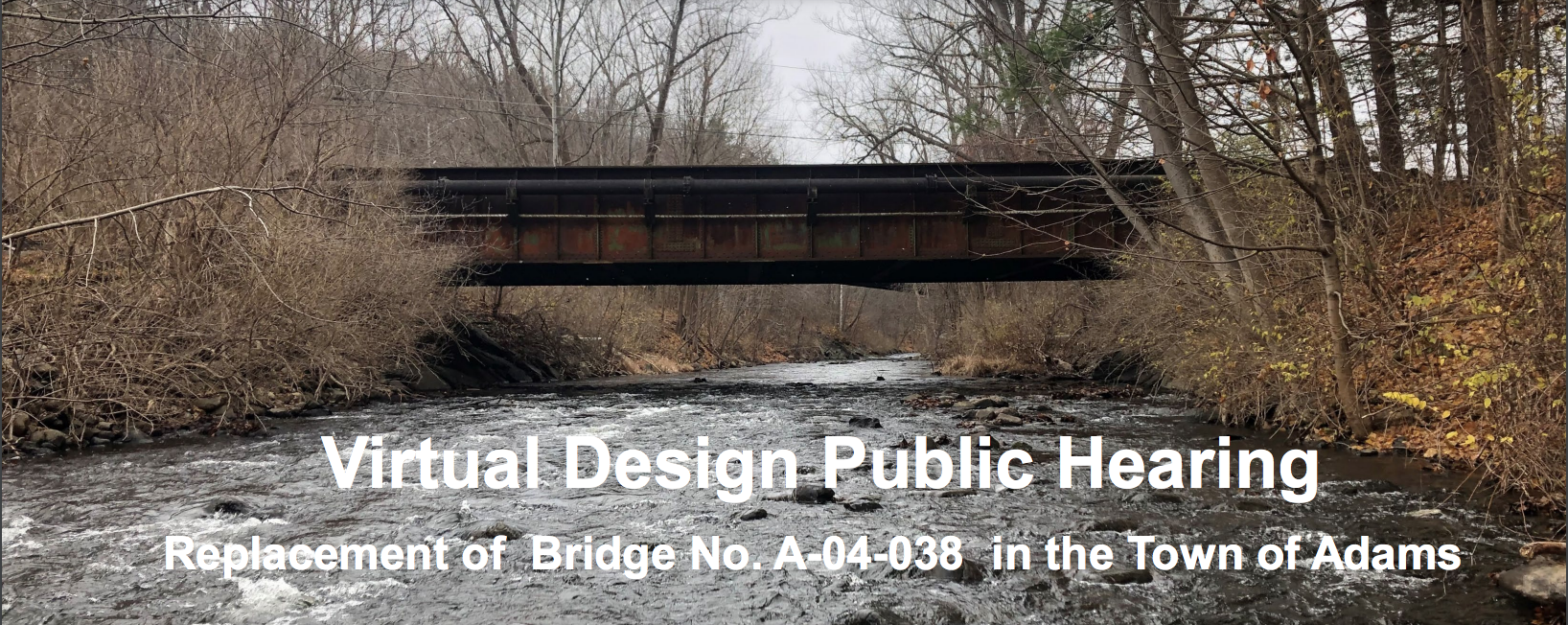 Virtual design public hearing on replacement of bridge No. A-04-038 in the Town of Adams; register here to participate via the internet: www.mass.gov/orgs/highway-