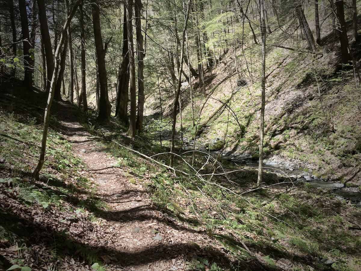 This is a moderate loop hike that involves a minor stream crossing (2-3 feet across, on a dry day) at the beginning and end. The trail is rooty and rocky, with a few short rock staircases. Much of the hike along the RRR Brooks Trail follows a narrow path with a steep drop-off. There will be the occasional muddy stretch throughout.