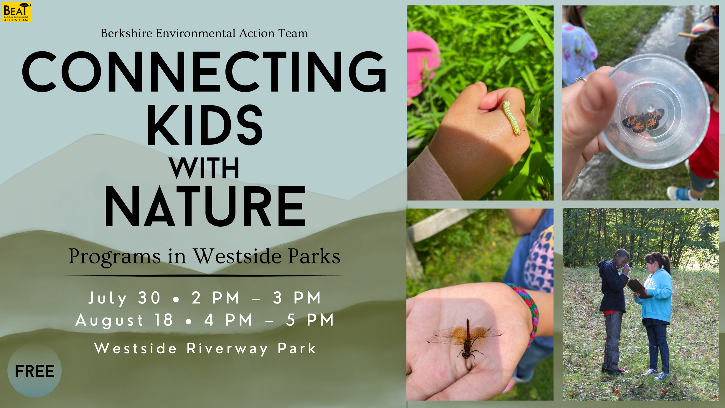 BEAT is offering an environmental and outdoor education youth program at Westside Riverway Park, 181 Dewey Ave in Pittsfield, on Saturday, July 30th, from 2 PM to 3 PM, and Thursday, August 18th, from 4 PM to 5 PM. The offered program will include a variety of hands-on activities that will engage kids with nature while learning and having fun! Some activities might include collecting and observing insects, exploring wildlife in the Housatonic, and making nature art.