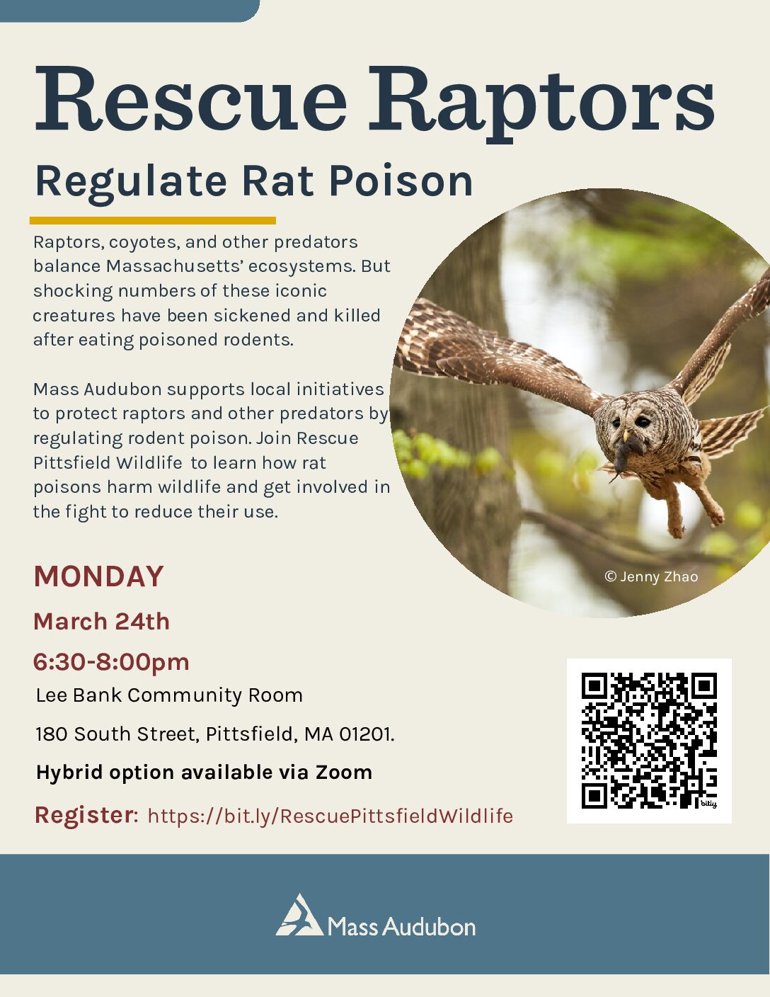 Lee Bank - Community Room 180 South St, Pittsfield, MARescue Pittsfield Wildlife from Rodenticides Raptors, foxes, and other predators balance Massachusetts’ ecosystems. But shocking numbers of these iconic creatures have been sickened and killed after eating poisoned rodents. Mass Audubon’s Rescue Raptors program supports groups in communities across Massachusetts…