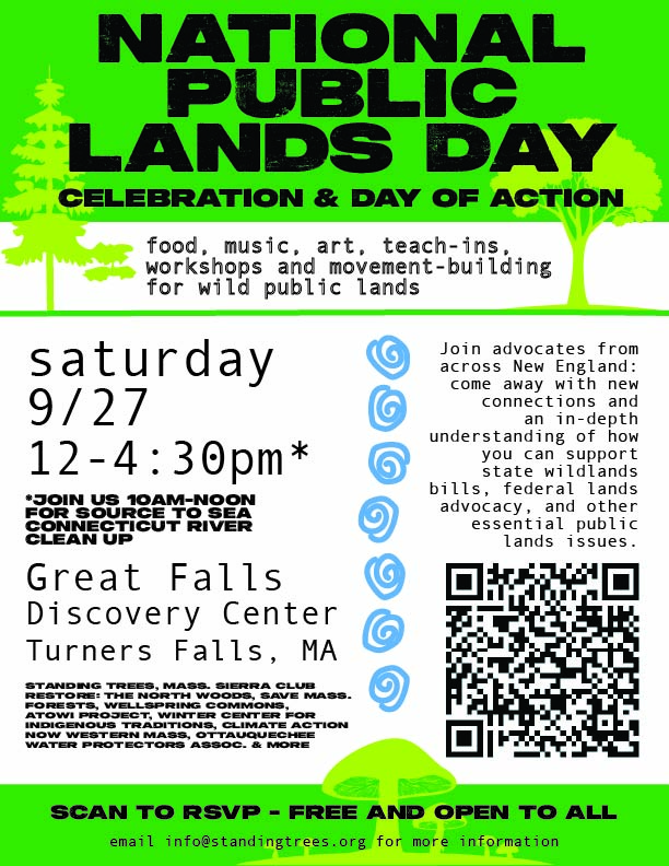 Great Falls Discovery Center 2 Avenue A, Turners Falls, MAJoin Standing Trees, Sierra Club MA, Save Mass Forests, RESTORE: the Northwoods, and other groups from across New England to celebrate National Public Lands Day. Expect fun, food, music, art, and an opportunity to deepen your knowledge about New England…