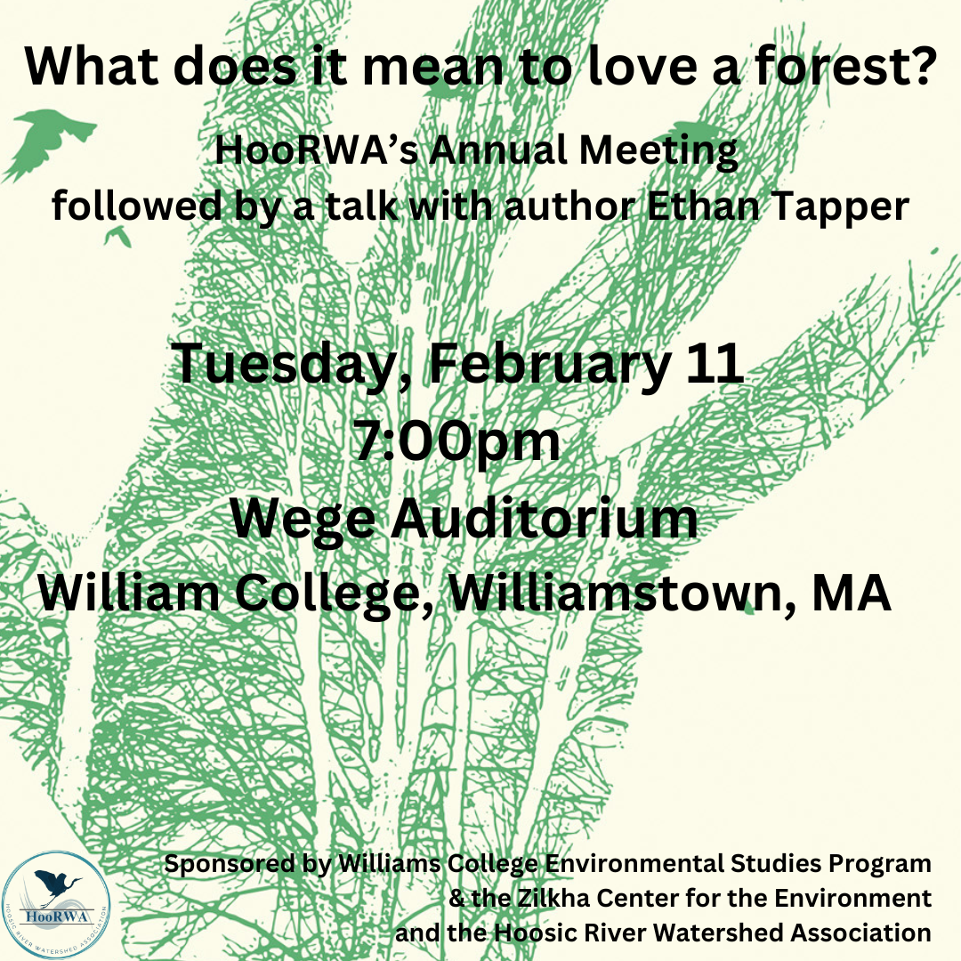 Join Hoosic River Watershed Association for HooRWA’s Annual Meeting followed by a talk by author Ethan Tapper. This event will take place in the Williams College Wege Auditorium and is sponsored by Williams College Environmental Studies Program & the Zilkha…