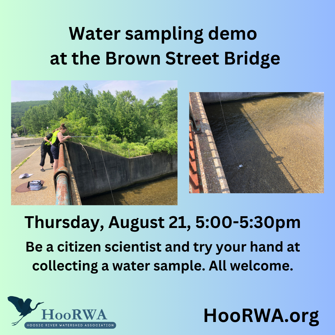 North Adams, MAHave you been wondering how the Hoosic River Watershed Association (HooRWA) collects water samples in the North Adams flood chutes to test for e.coli? Stop by the Brown Street Bridge in North Adams for a demonstration of collection technique and…