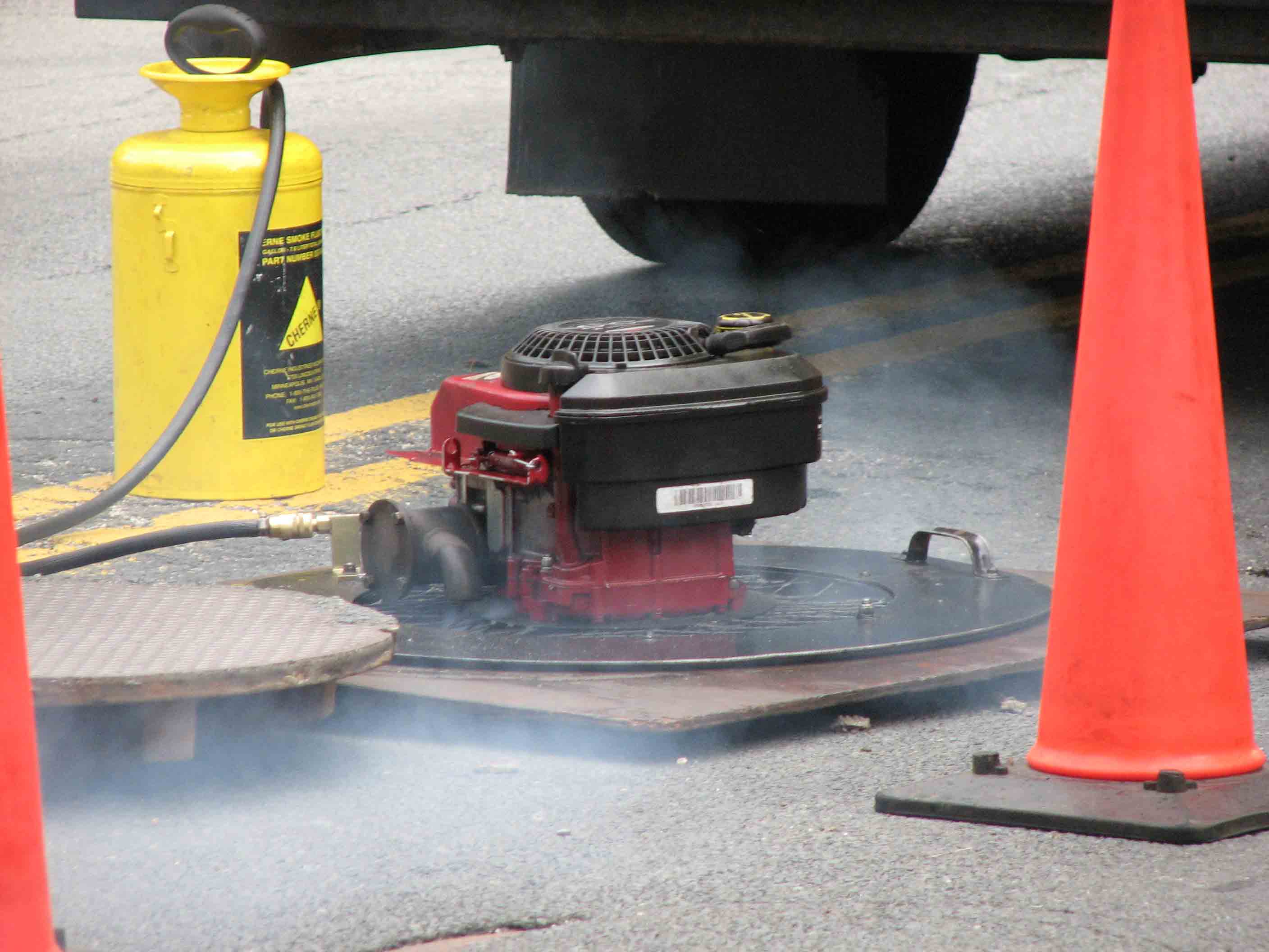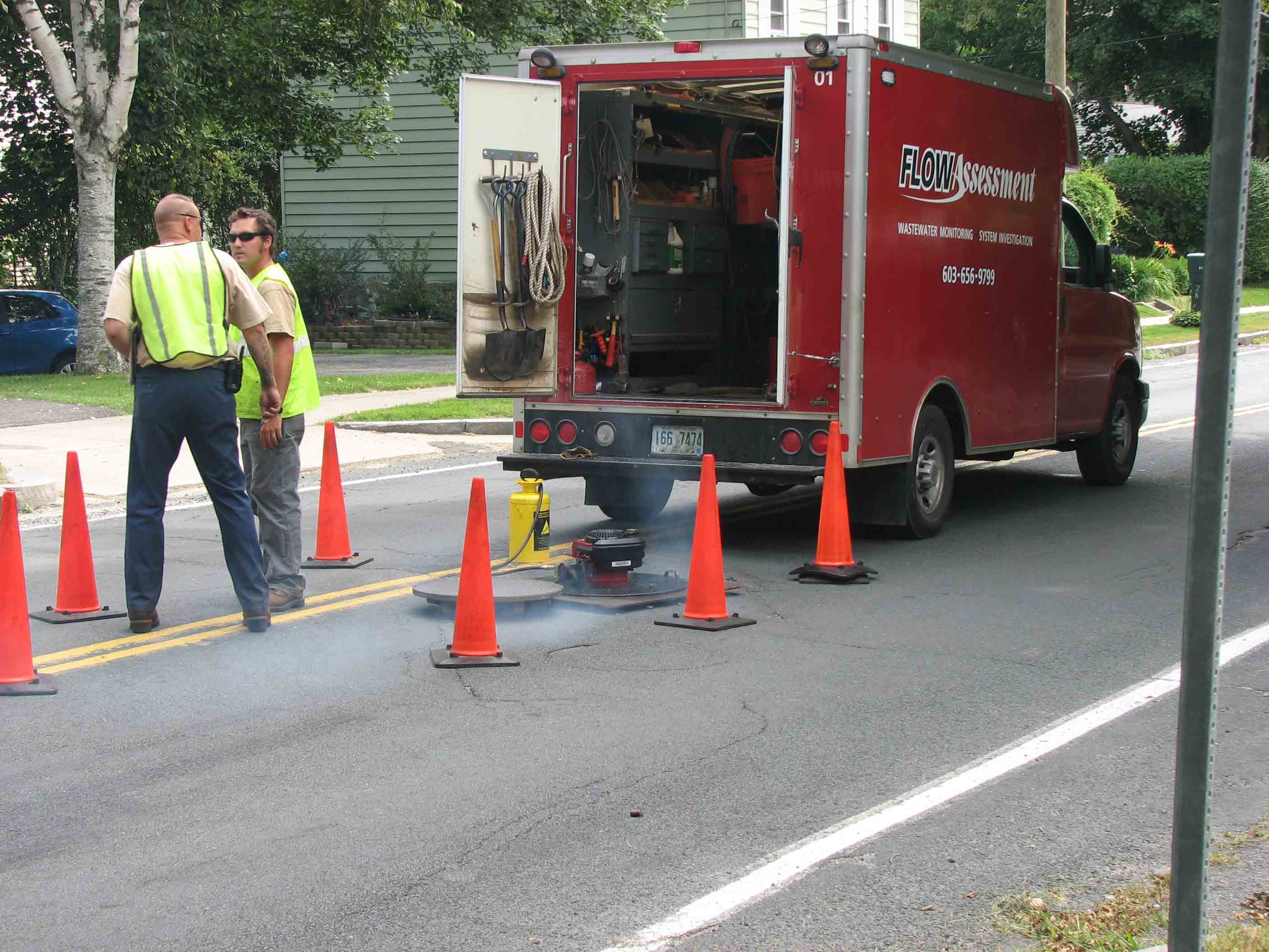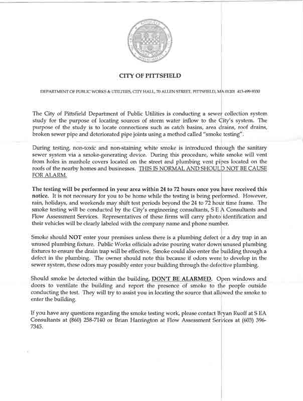 In August, 2008, the City of Pittsfield, MA began to take action to detect Inflow and Infiltration by doing “smoke testing”.Here is the paper they left at every house in the areas that were to be tested.And here are pictures of the actual testing.truck in middle of road close up of smoke device covering a man hole smoke coming out of a vent pipeIn this area they didn’t find any problems. You could see the “smoke” coming out the vent pipes from many people’s homes, but this isn’t a problem. It is a vent from the sewer line. If smoke comes out of a storm drain, or out through someone’s basement from a sump-pump, or something like that – then there is a problem.