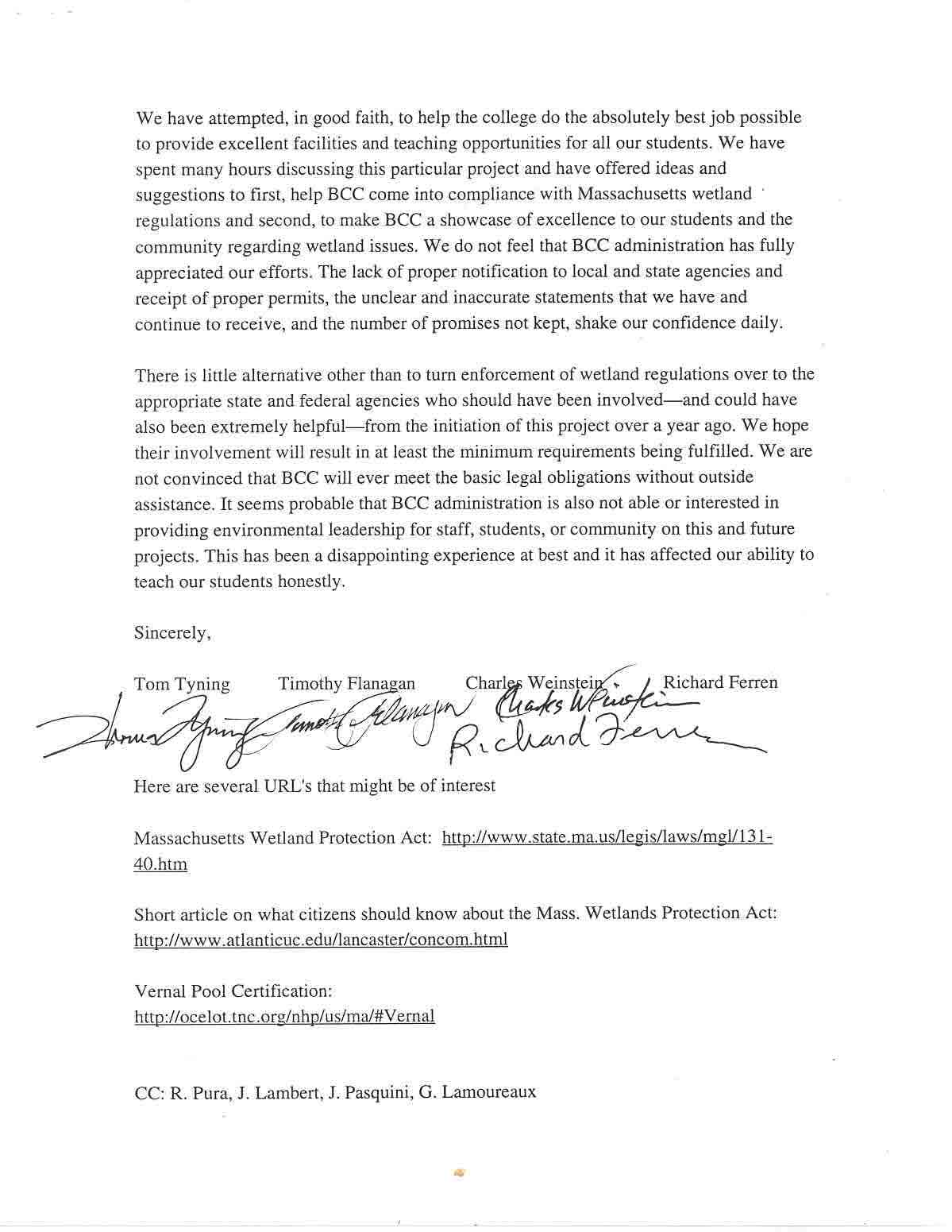 A letter from the Berkshire Community College environmental faculty to the college’s president. Note that the college had still not informed the faculty that the Notice of Intent had already been filed.