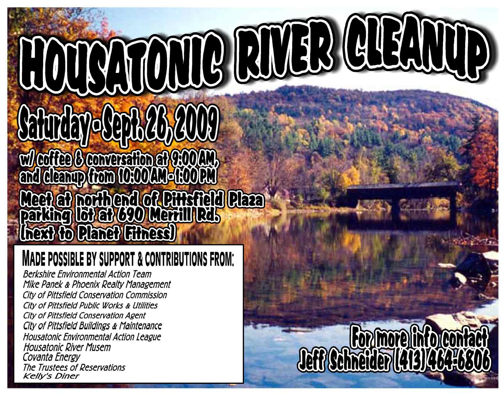 | Housatonic River Cleanups – June 6 & 13 My name is Jeffrey Schneider, and I am writing in regard to a Housatonic River Cleanup taking place on June 6, 2009, and a second cleanup occurring on June 13, 2009. You are receiving this email because you signed up to be notified about the cleanup, or are an acquaintance of mine that might be interested in knowing about this event and other similar functions in the future. The cleanups are being organized by Berkshire Regional Activist and Volunteer Organization (BRAVO) in collaboration with Berkshire Environmental Action Team (BEAT). Details about each event are below, followed by additional volunteer opportunities associated with the cleanups if anyone is interested.1) Saturday, June 6, 2009 @ 366 Newell Street, Pittsfield, Massachusetts. Parking is available at Belanger Athletic Field, across the street from our rendevous point on Newell Street. The event begins at 10:00 AM and will go until approximately 5:00 PM, but you may arrive and leave anytime. We will be cleaning up the section of river along Parkside Avenue and nearby area.There will be donuts and coffee compliments of Dunkin Donuts for those who will be present in the morning, and pizza compliments of East Side Cafe for those present at the end of the day.2) Saturday, June 13, 2009 from 10:00 AM to 5:00 PM (but as with the 6th, you may come and go whenever you’d like). Currently we do not have a rendevous point or a suitable location for serving the donated donuts & coffee and pizza. I asked Harry’s Supermarket to use part of their parking lot, but was told that would not be allowed. I am in the process of contacting other suitable locations in the area. If anyone has any suggestions or perhaps has a house or knows someone with one in the vicinity, please contact me. We will be cleaning up the section of river in the vicinity of Elm Street, along Deming Street and the surrounding area.As for the other volunteer opportunities for anyone interested, there are as follows: