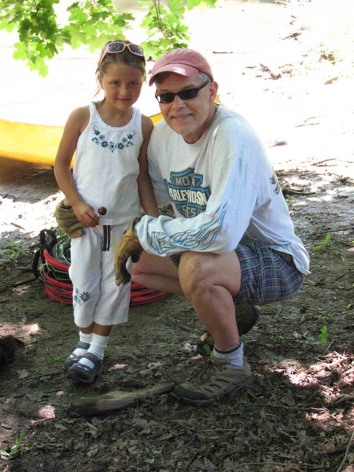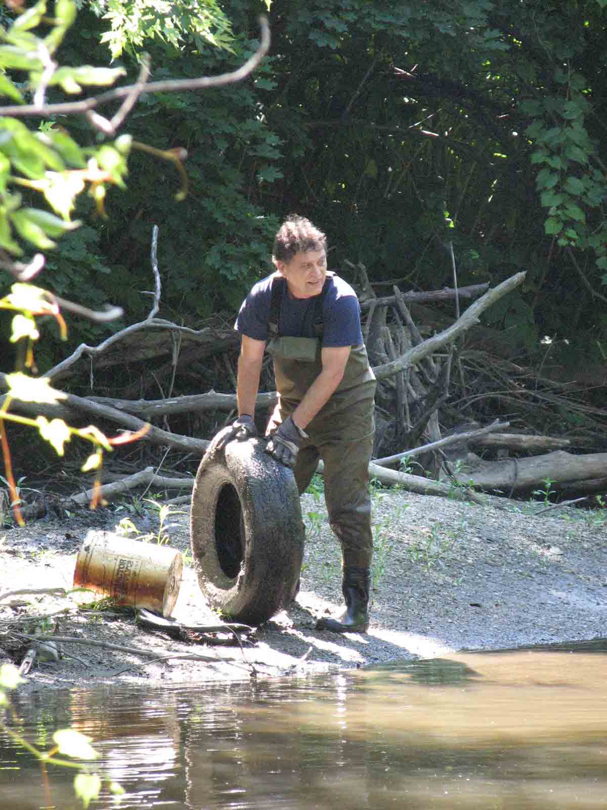 | Bruce is a master at getting tires out even when they were buried in mud. | David takes an important call. | Fred hauled trash from the river up the bank to the South Street bridge. |
