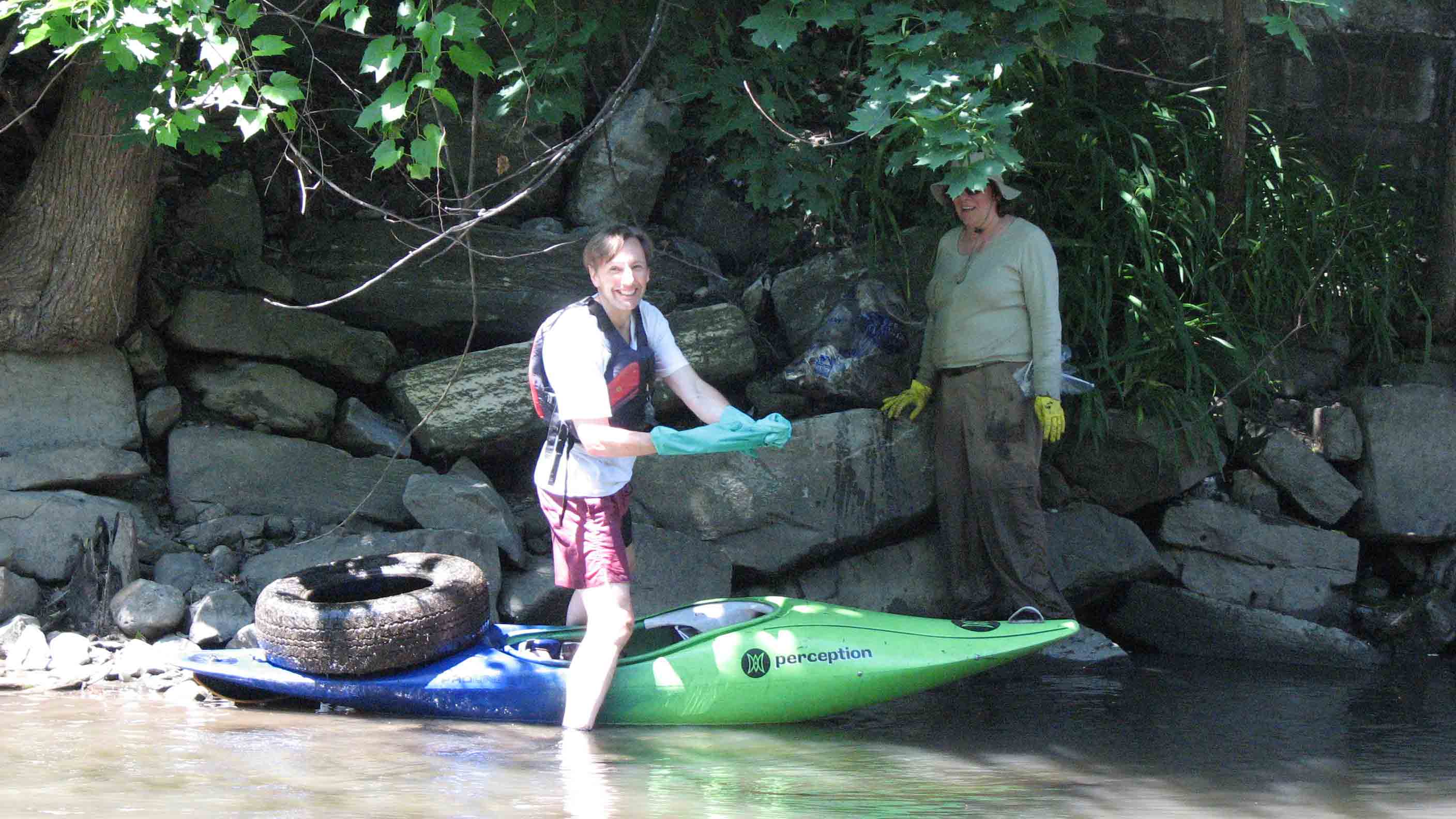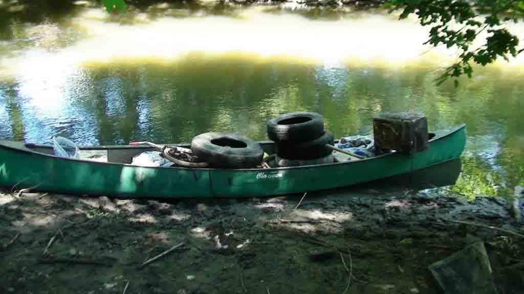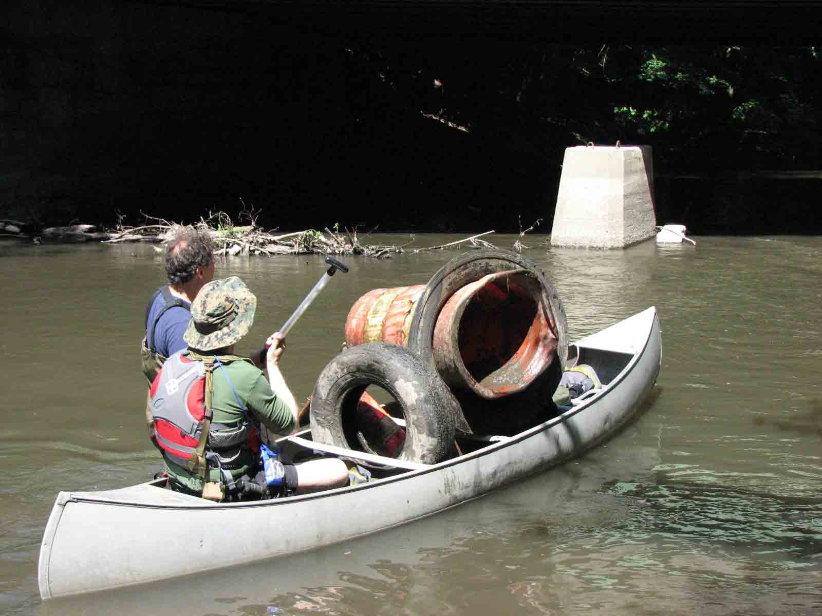 | Yvonne in her new waders! | We canoed trash to the haul-out points. | There was lots of big trash below the South Street bridge. |