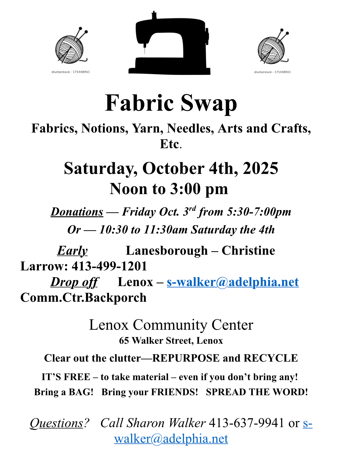 Free to take materials. Clean out your clutter, repurpose and recycle. Donations drop off Friday Oct 3rd 5:30PM - 7PM or Saturday Oct 4th 10:30AM - 11:30AM DATE: Saturday, October 4 TIME: 12:00 PM - 3:00 PM LOCATION: Lenox Community…