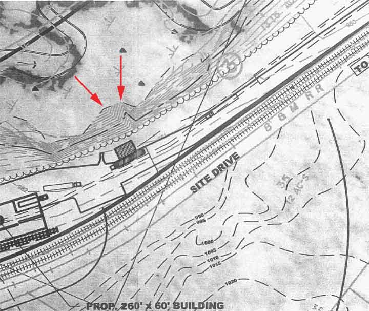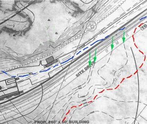 On both plans we have outlined the 1010′ contour in red (solid on the City’s topographic survey – dashed on SK Design Group’s plan). Notice on each plan, the distance from this contour line to the railroad tracks. Notice also the contour lines indicated by the four green arrows. These contour lines on the SK Design Group’s plan end as they approach the railroad tracks. (See tutorial on Topographic Maps) Notice these contour lines do not end on the City’s topographic survey.