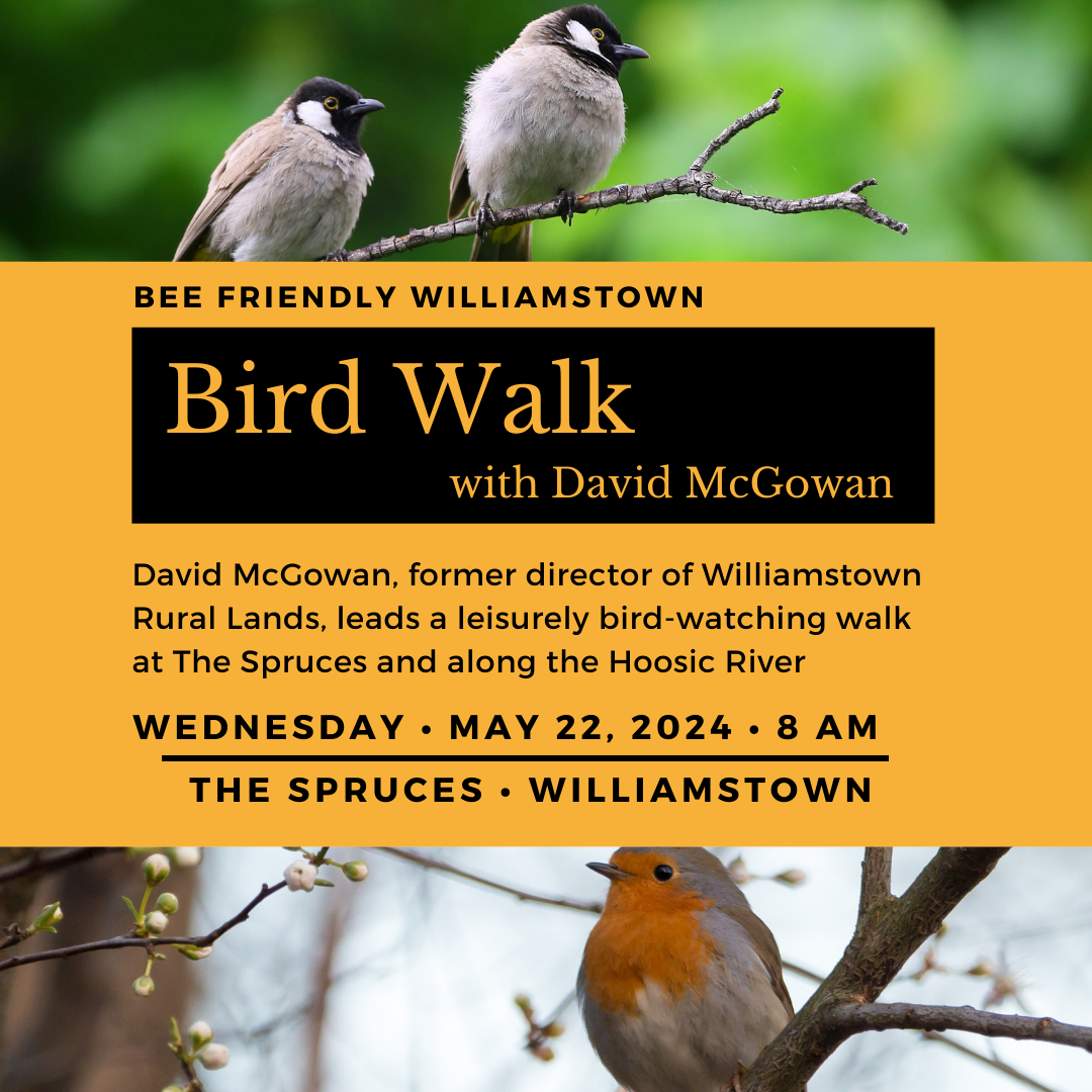 The Spruces 60 Main St., Williamstown, MABird Walk at The Spruces with David McGowan on Wednesday, May 22 at 8AM David McGowan, former director of Williamstown Rural Lands, leads a leisurely bird-watching walk at The Spruces and Hoosic River. Gather by the picnic tables at the pond near the pollinator garden (60 Main St.…