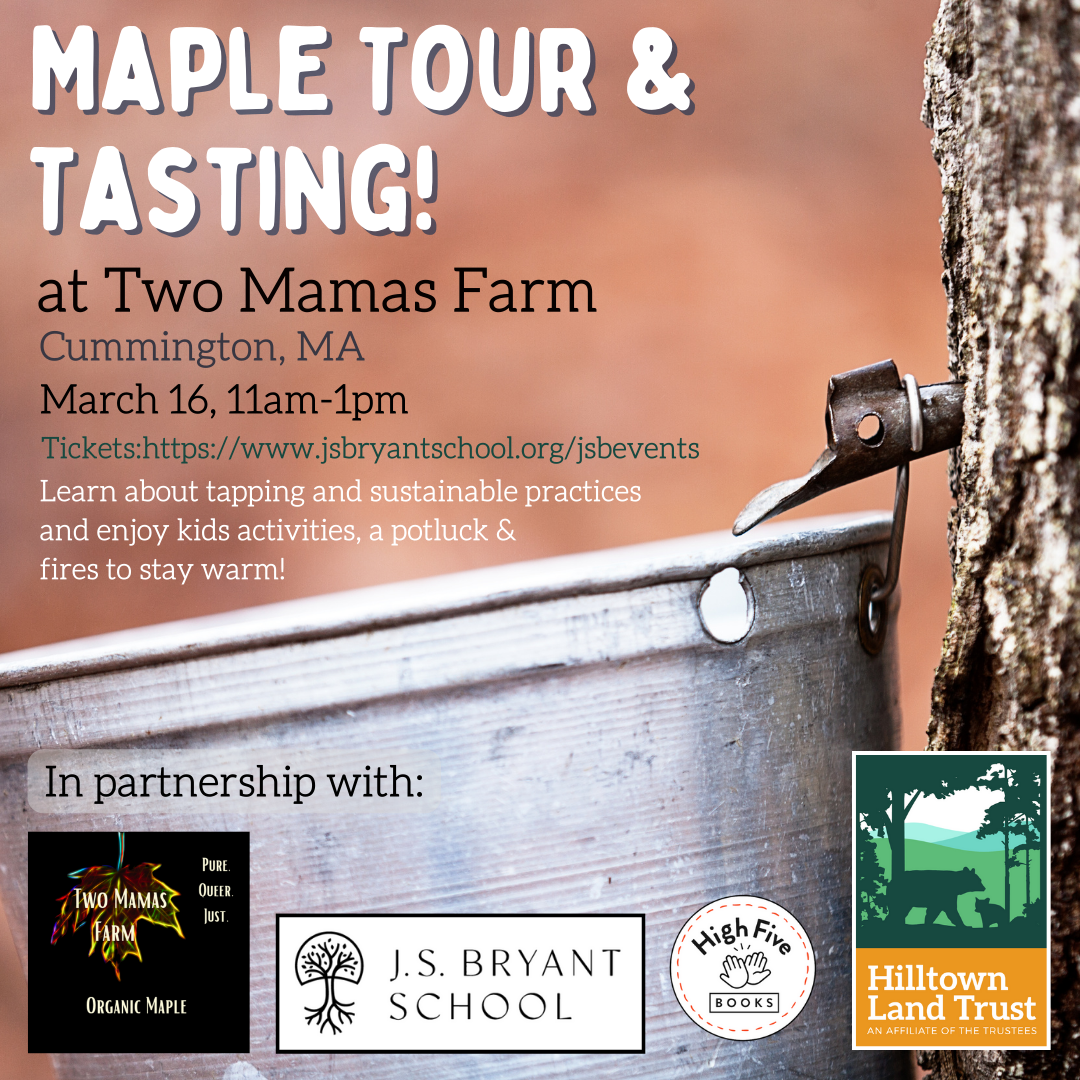 Two Mamas Farm 11 Porter Hill Road, Cummington, MAJoin Two Mamas Farm, the Hilltown Land Trust, the J.S. Bryant School, and the High Five Books team for a very special family-friendly tour of queer-run Two Mamas Farm, where you’ll learn more about small-scale maple tapping and sugaring. The High Five Team will…